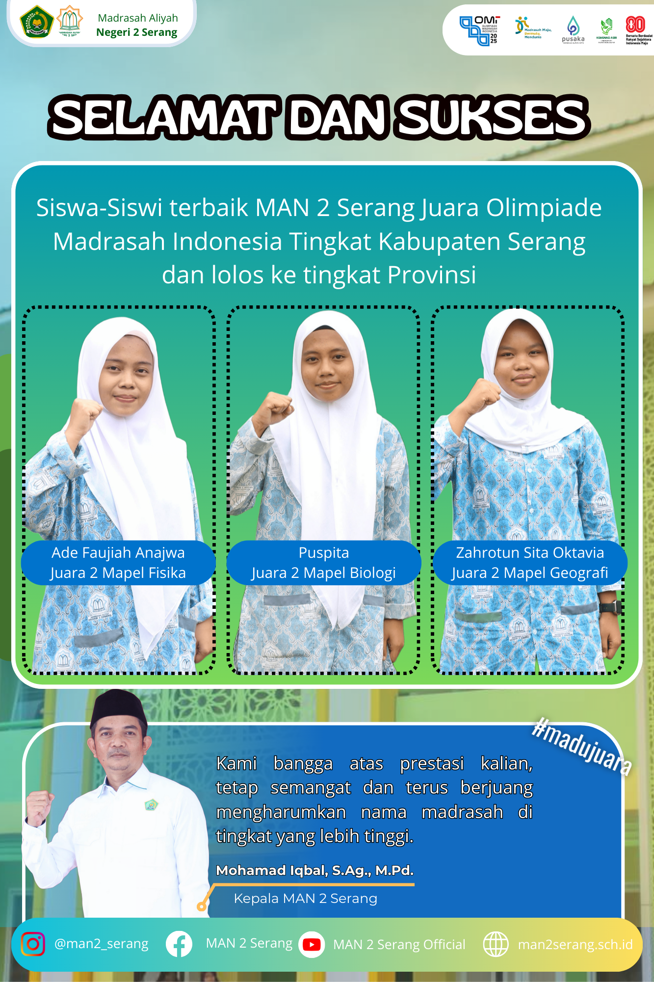 Selamat dan Sukses siswa-siswi terbaik MAN 2 Serang Juara Olimpiade Madrasah Indonesia Tingkat Kabupaten Serang dan lolos ke Tingkat Provinsi